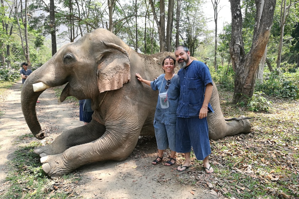 En el segundo fuimos a un campo de protección de elefantes y lo disfrutamos muchísimo, de menos a más. El tipo nos recogió tarde, luego nos hizo esperar dentro del coche mientras hacía la compra, apenas nos dejó tiempo para desayunar en la parada técnica, luego tardamos una eternidad en llegar y ya allí nos encasquetó unos uniformes de trabajo sin más explicación que un índice señalando. Y fue acercarnos al elefante y cambió el aura. Le dimos de comer con cautela, lo acompañamos a que se rascase con curiosidad, lo hidratamos de barro con camaradería y lo bañamos en el río con diversión. Entre medias, hubo guerra de barro y agua entre nosotros, una clase de cocina con siestecilla posterior, un encargado progre y burlón gorroneándonos tabaco y una madre y una hija inglesas compitiendo por el hortera de oro. Para terminar, fuimos a ver una pequeña cascada de los alrededores, visita corta para nosotros, más corta aún para la madre inglesa que decidió haber tenido bastante nada más resbalarse en la roca y caer de culo en el agua.