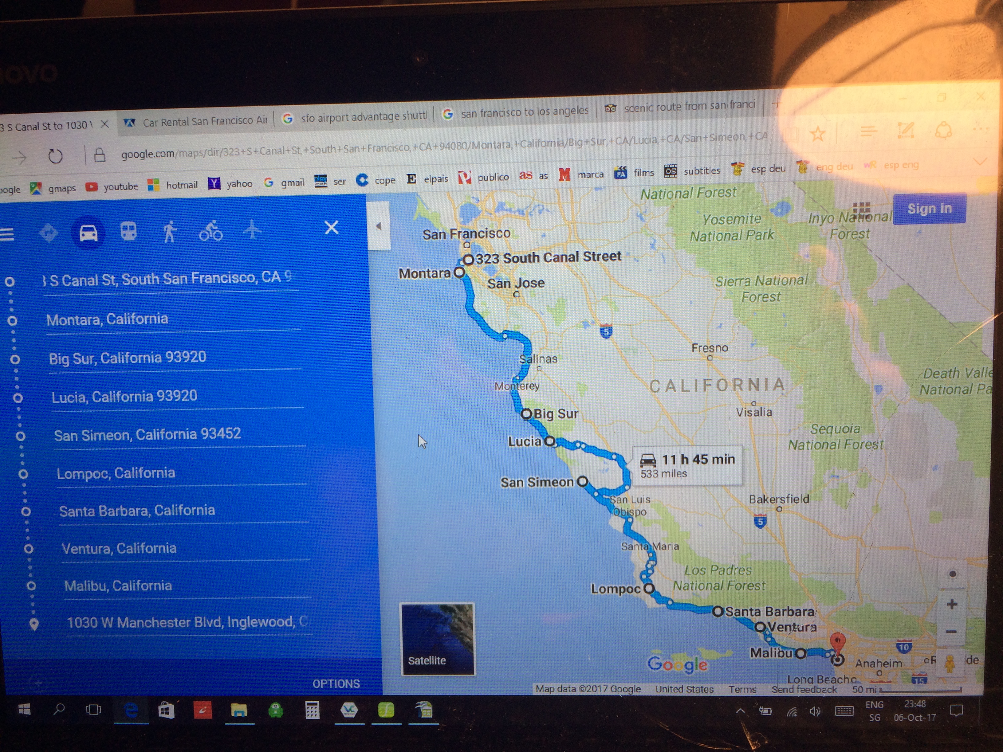 Queda confirmado, iueséi, con sus carreteras anchas, gasolina barata, distancias largas y tranquilidad al volante, es un país por y para coches. Si te vas a equivocar de giro y das un volantazo a izquierdas sin intermitente, tranquilo, el camionero de atrás te da las gracias, si doblas el límite de velocidad permitido y te adelanta por la derecha una familia de mormones, tranquilo, hay 6 carriles de M-30, si se te cansa la pierna izquierda de tanto pisar y soltar el embrague en el atasco, tranquilo, el cambio es automático y lo que has reducido a cenizas era el estuche de las gafas. Así que ni cortos ni perezosos encaminamos nuestros pasos a una agencia de alquiler de vehículos y, tras primero equivocarnos de mostrador y depués esperar a que fabricaran el coche, salimos rumbo al sur, a recorrer la escénica highway 1 que, bordeando la orilla, une Santurce con Bilbao.